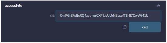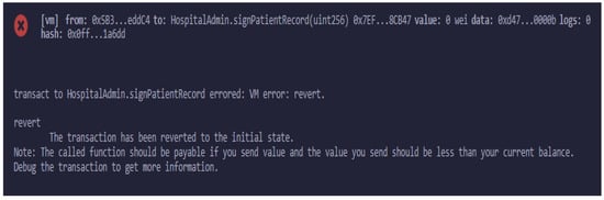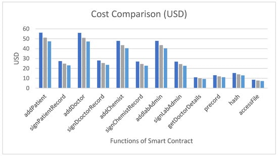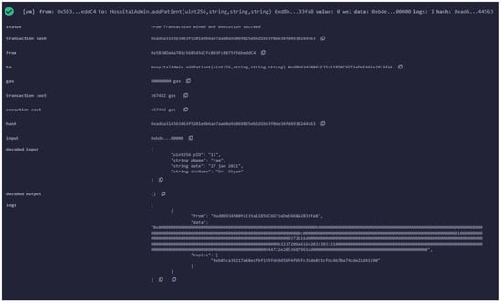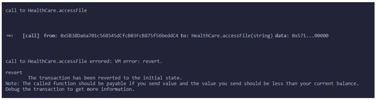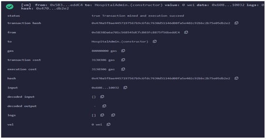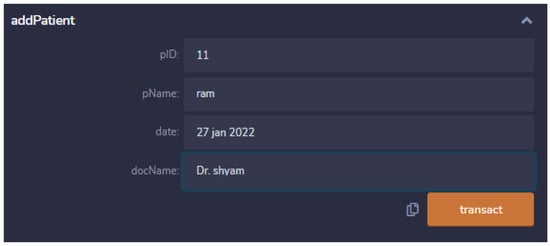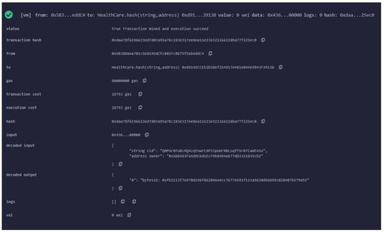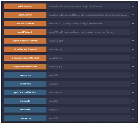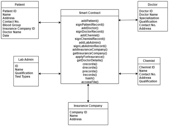 Multiple entities, such as patients, doctors, and insurance companies, are associated with the smart contract with the help of different functions, as shown in Figure 6. These entities interact with each other via smart contract functions.