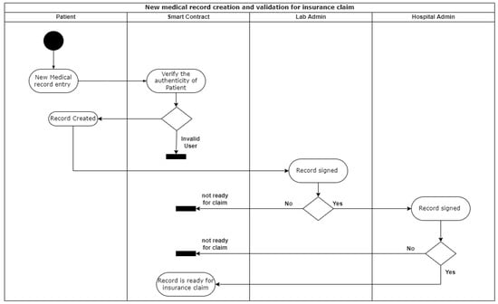 The workflow of the process of record creation and insurance claim validation is shown in Figure 7. The proof-of-authority consensus procedure is employed in our suggested paradigm. Few selected nodes can function as validators in this algorithm to validate transactions. Because only preselected validator nodes will validate the transaction, the time necessary to create a block is predictable and smaller than the time required to generate a block using the PoW.