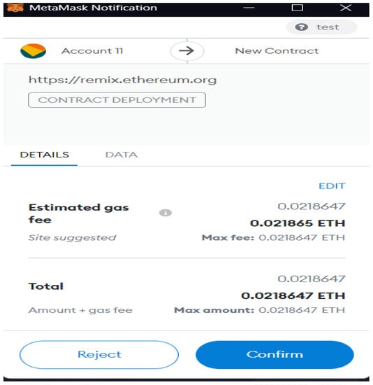 We deploy a smart contract using Remix IDE and a Metamask wallet, then a confirmation pops up from the Metamask wallet as shown in Figure 8. It shows the activity of the transaction confirmation before its execution. Metamask wallet is used by the entities to connect with the system. This wallet stores the information about the account of the entities such as the number of ethers, address of the entity, etc.