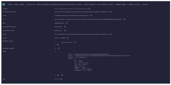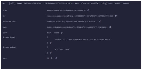 In our proposed architecture, a smart contract is created that provides metadata about record data, ownership, and permissions. Cryptographically signed instructions for controlling these characteristics are included in our system’s blockchain transactions [50,51,52,53]. Only legal transactions ensuring data alternation are used by the contract’s state-transition functionalities to carry out the rules. If a medical record can be represented computationally, laws may be built to enforce any set of rules governing it. For example, before providing third-party viewing access, a policy may require separate consent transactions from patients and healthcare providers. For complicated healthcare workflows, we created a solution based on blockchain smart contracts. Smart contracts are created to manage data access permissions across different actors in the healthcare ecosystem, as shown in Figure 4.