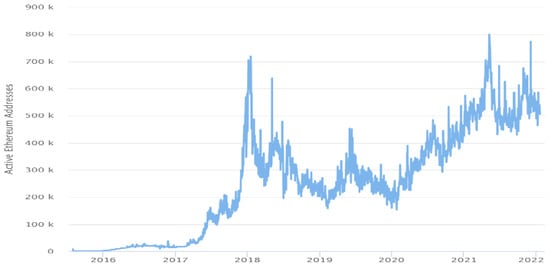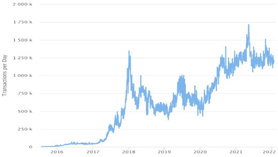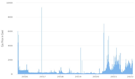 The Ethereum blockchain is used for the deployment of the proposed solution. Use of the Ethereum blockchain is increasing day by day. More and more addresses are being registered on it, as shown in Figure 25. The gas price on the Etherum blockchain change daily. The average gas price during 2016 to 2022 is shown in Figure 26. As the number of registered users are increasing, the daily transaction execution count is also increasing, as shown in Figure 27.