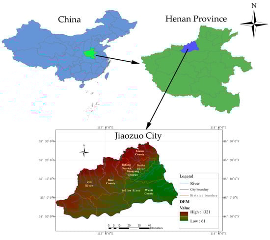Jiaozuo City, frequently affected by floods, was selected as the study area. It is located in the northwest of Henan Province (Figure 1). The total area of Jiaozuo City is about 4071 km2 and contains 10 county-level districts. The total resident population was about 3.52 million at the end of 2020. The terrain in the northern part is higher than that in the south and the altitude ranges from 61 m to 1321 m above mean sea level, with an average elevation of 500 m. Climatically, it lies in the temperate monsoon climate region; the annual precipitation is about 500~700 mm and its annual distribution is extremely irregular (about 80% occurring from June to September). Historical statistics showed that a damaging flood occurred in Jiaozuo City in 1996, which was the worst flood in recent Jiaozuo history. It caused more than 85,000 hectares of fields in our city to be flooded, and 13 roads were washed out by floods. A torrential flood in July 2016 resulted in the productivity of Jiaozuo Wanfang Aluminum company being seriously affected. The most recent flood was in July 2021 and led to USD 310 million in damage; 744 thousand people were affected and around 11,564 houses were destroyed.
