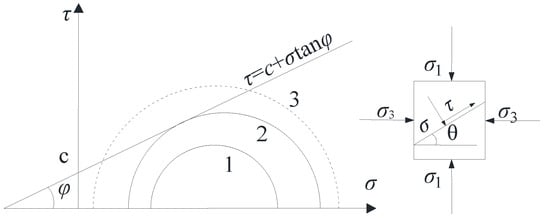 The Mohr–Coulomb criterion can be used to judge whether any point of the roadway-surrounding rock is in an elastic state or a plastic state, as shown in Equation (2) and Figure 2.
