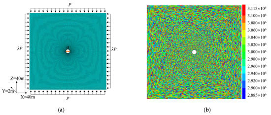 According to the different boundary stress conditions adopted in the mechanical model, the study of the surrounding rock’s plastic zone can be divided into two categories: Equal pressure and unequal pressure [,]. Under the conditions of equal pressure, scholars have used the Fenner equation (Fenner, 1938) or Kastner equation (Kastner, 1951) to study the boundary range of the surrounding rock’s plastic zone [,]. For unequal pressure conditions, most scholars use approximate analytical algorithms based on the elastic-plastic theory [,,], and there is no accurate stress analytical solution at present. Zhao et al. [,] obtained the shape characteristics and distribution law of the surrounding rock’s plastic zone through the boundary equation of a homogeneous circular roadway, which is widely used to guide the stability control of a coal mine roadway [,,,]. Guo et al. put forward the analytical solution of the radius characteristics of the plastic zone of the surrounding rock and obtained the shape characteristics of the plastic zone under the conditions of equal pressure or unequal pressure [,]. These analytical algorithms have made important contributions to understanding the shape evolution characteristics of the homogeneous surrounding rock plastic zone. However, in the real rock mass environment, the shape characteristics and distribution law of the plastic zone of roadway-surrounding rock are inevitably different from such homogeneous surrounding rock [,]. At present, the research on heterogeneous rocks mainly focuses on the influence of mechanical parameters on the failure behavior of rocks. Specifically, Wang et al. studied the deformation behavior, damage accumulation, and progressive failure process of heterogeneous coal through FLAC3D and experiments [], while Zhang et al. studied the influence of shale bedding on the stress–strain response, failure mode, and shear strength by establishing a heterogeneous numerical simulation model []. Furthermore, Jonak et al. studied the rock fracture process and its influencing factors using a numerical simulation method [,,].