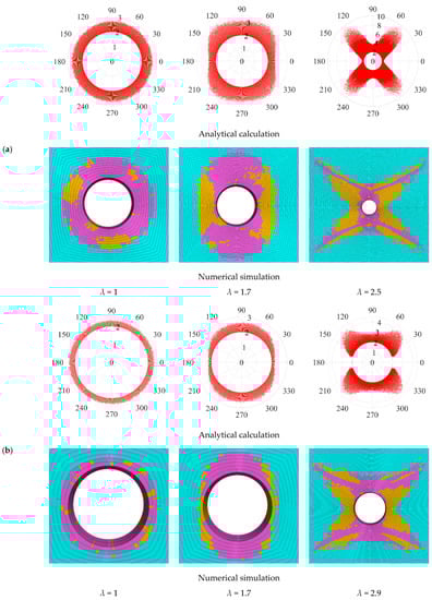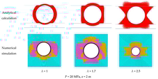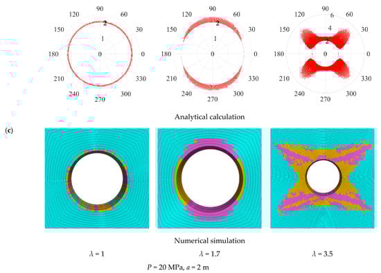 Figure 13 shows the statistical results of the plastic zone boundary under non-isobaric conditions using an analytical algorithm and numerical simulation. It can be seen that with the increase in the lateral pressure coefficient, the boundary of the plastic zone increases with the increase in the lateral pressure coefficient.