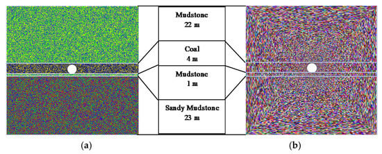 When the size of a rock layer is large enough, the plastic zone of the surrounding rock of the roadway is usually in a single layer. In order to simplify the problem, it is assumed that the particles in the layered structure are uniform in size and distribution. The numerical calculation of FLAC3D adopts the Mohr–Coulomb constitutive model, which is consistent with the analytical calculation. In the model, X × Y × Z = 40 m × 2 m × 40 m, as shown in Figure 3a. The total number of zones and gridpoints is 120,000 and 180,720, respectively. Figure 3b is the result of the random assignment of the cohesion of zone elements in the FLAC3D single-layer Coal model.