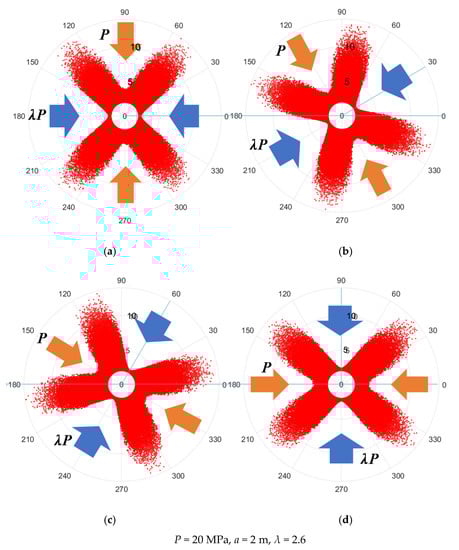Taking coal as the research medium, according to Equation (3), the plastic zone maximum radius and the shape of the plastic zone of roadway-surrounding rock under different lateral pressure coefficients are obtained, as shown in Figure 8. As can be seen, when λ = 1, the plastic zone is standard circular. With the increase or decrease in the lateral pressure co-efficient λ, the shape of the plastic zone changes from circular to ellipse and butterfly. The difference is that when the lateral pressure coefficient decreases gradually (0 < λ < 1), the plastic zone gradually becomes a vertical butterfly. When the coefficient of lateral pressure increases gradually (λ > 1), the plastic zone gradually changed into a horizontal butterfly.