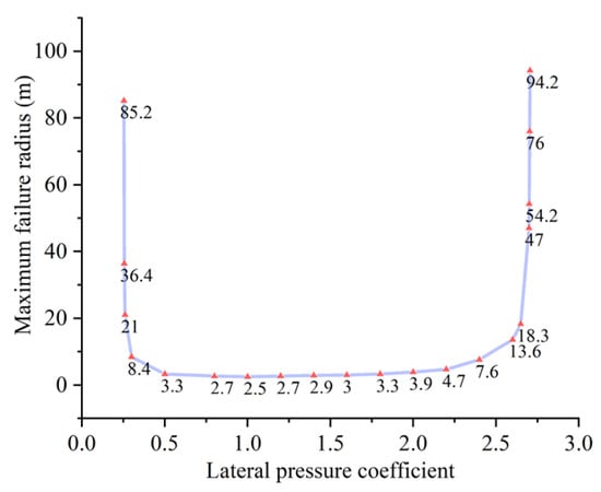 In addition, it can be seen from the curve in Figure 8 that the plastic zone ranges of the butterfly-shaped plastic zone are particularly sensitive to a change in the lateral pressure coefficient. When the plastic zone of the roadway-surrounding rock changes to become butterfly-shaped, a small change in the lateral pressure coefficient will cause the sharp expansion of the plastic zone, and then cause the large-scale failure of the roadway-surrounding rock.