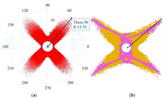 According to the mechanical model shown in Figure 1, specifying the stress state of point A (R, θ), when the angle between the maximum confining pressure and the horizontal direction is α, then the stress state corresponding to point A is also transferred to point B (R, θ + α). Assume θ1 = θ + α, that θ = θ1 − α. If we take (R, θ1 − α) into Equation (1) and combine Equation (2), then the shape equation of the plastic zone of the roadway-surrounding rock with different rotation angles (α) can be obtained (Equation (4)).