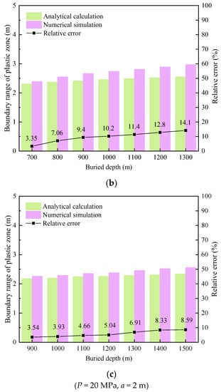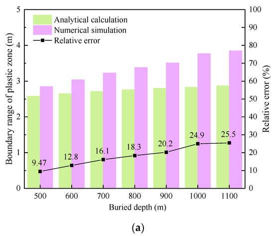 It can be seen from Figure 10 that the calculation result obtained by the analytical algorithm is smaller than that by numerical simulation. With the increase in the roadway burial depth, the boundary of the plastic zone continuously increases. The boundary of the plastic zone calculated by numerical simulation increases almost linearly with the increase in the burial depth, while the boundary of the plastic zone obtained by the analytical algorithm increases relatively slightly with the increase in the burial depth. The relative error of the two methods increases with the increase in the burial depth, that is, the relative error is positively correlated with the burial depth. Under the same burial depth, comparing the three kinds of surrounding rock with different strengths in Figure 10a–c, it can be seen that the relative error of the two calculation methods decreases with the increase in the surrounding rock strength, and its relative error is negatively correlated with the strength of the surrounding rock.