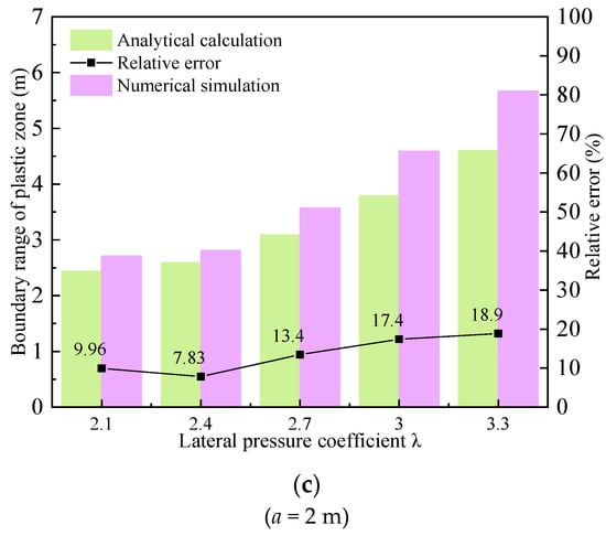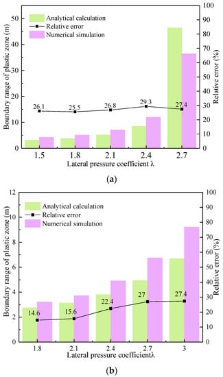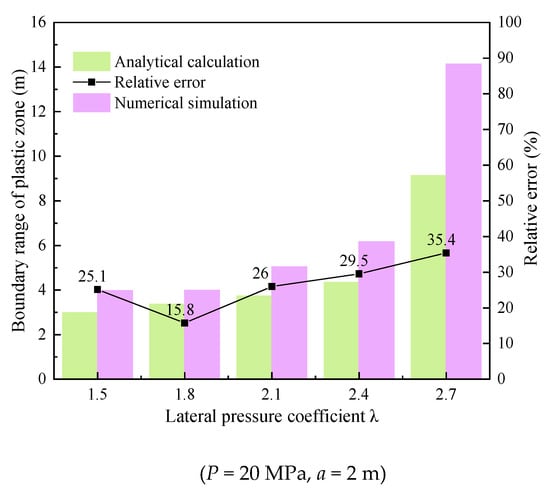 Under the condition of bi-directional unequal pressure (λ ≠ 1), the statistical results of the analytical calculation and numerical simulation of the plastic zone boundary of the single heterogeneous surrounding rock are shown in Figure 11. It can be seen from Figure 11 that with the increase in the lateral pressure coefficient, the boundary of the plastic zone increases gradually. When the plastic zone is elliptical, the increase in the boundary of the plastic zone is small. At this time, although the relative error between the analytical algorithm and numerical simulation has an upward trend, the change is not large. When the shape of the plastic zone changes to a butterfly shape, the boundary of the plastic zone begins to increase greatly with the increase in the lateral pressure coefficient, and the relative error of the two calculation methods also increases. On the whole, the relative error of the two calculation methods is positively correlated with the lateral pressure coefficient. When λ = 2.1, the shape of the plastic zone begins to transform from an ellipse into a butterfly, and the maximum value of the plastic zone boundary also transfers from the vertical direction of the ellipse to the shoulders and two bottoms of the roadway. At this time, the plastic zone boundary increases slightly, and the relative error of the two calculation methods is approximately 26.8%. When λ is 2.4 and 2.7, respectively, the shape of the plastic zone shows an obvious butterfly shape, and the boundary of the plastic zone begins to expand rapidly along the butterfly leaf. It is worth noting that when λ is 2.7, the boundary ranges of the plastic zone obtained by the analytical calculation are larger than that of numerical simulation, and the relative error of the two methods is also reduced.