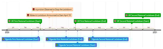 In 2020, Malawi experienced two waves of COVID-19, with the highest peak infection rate of about 220 cases daily in July []. The government announced a lockdown slated to start on 18 April 2020 in which all educational facilities were to be closed, a night-time curfew instated, public gatherings restricted to 50 people, and a ban on international passenger flights and public transport []. The government restrictions were met with an injunction from the country’s High Court and eventually were overturned on 10 September []. Stringent restrictions, however, had been implemented in Uganda in March with the first lockdown lasting 7 weeks. Following the rise of daily cases to 1900 in June, another full lockdown of 7 weeks was announced. Similarly, the UK announced its first full lockdown in March which was eased in May and completely relaxed in June. A second full lockdown was announced in November which lasted for 4 weeks. A summary of when lockdowns came into place and how long they lasted can be seen in Figure 2. In relation to the UK, the indicated dates in Figure 2 are those which were binding upon all constituent countries.