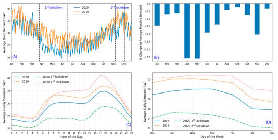 A comparison of 2019 and 2020 ESI performance in the United Kingdom: (A) Average daily demand with start and end duration of the national lockdowns represented; (B) The percentage change in average monthly connected load; (C) profile of the daily demand including demand profiles during the two lockdowns; (D) profile of average daily demand in a typical week.