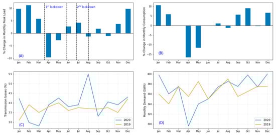 A comparison of Uganda’s ESI performance for both 2019 and 2020: (A) change in monthly peak load with a demonstration of the spans of the two national lockdowns; (B) percentage change in total monthly electricity consumption; (C) profile of transmission losses; (D) total monthly consumption.