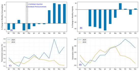 A comparison of Malawi’s ESI performance in 2019 and 2020: (A) change in total monthly electricity consumption; (B) change in total monthly electricity imports; (C) profile of electricity transmission losses; (D) total monthly amount of electricity generated.