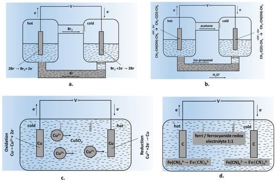 Schematic representations: (a) KBr/Br2-based TEC cell, (b) acetone-isopropanol thermocell, (c) Cu2+/Cu system in CuSO4 solution with soluble electrodes, (d) a ferrite/ferrocyanide redox couple ([Fe (CN)6]3−/[Fe (CN)6]4−) with inert electrodes.