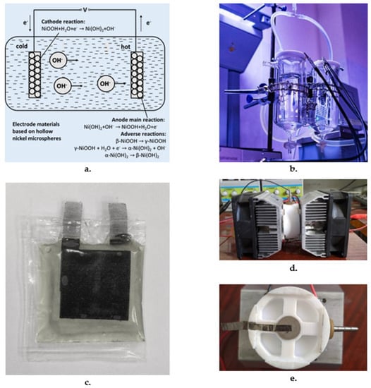 (a) A schematic representation of KOH redox reactions mediated by Ni hollow microspheres, (b) and assembled cells with water heating/cooling and salt bridge, (c) polymer film body, (d) cell with adjustable distance between electrodes heating/cooling by Peltier elements, (e) structure view of the adjustable cell.