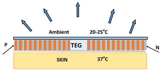 Among the well-known thermoelectric materials, alloys of bismuth telluride with antimony and selenium have been investigated extensively for room-temperature operations. (BixSb1−x)Te3 alloy system is a p- type semiconductor legs with ZT ranging between 1–2; Bi2Te3−xSex is an n-type semiconductor legs with ZT around 1 [91,92,93]. An array of p- and n-type semiconductor legs are arranged in a thermoelectric module and are electrically connected in series, and then thermally connected in parallel towards greater overall efficiency [94]. A schematic representation of a typical TEG circuit in the form of a wristband for harvesting body heat is shown in Figure 3.