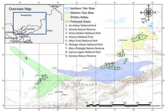 - Dimeyeva, L.A.; Ussen, K.; Sultanova, B.M.; Islamgulova, A.F.; Zverev, N.E.; Imanalinova, A.A.; Masimzhan, M.; Ablaikhanov, E.T. Fitotsenoticheskoe raznoobrazie gornykh khrebtov i mezhgornykh dolin vostochnoy chasti Severnogo Tyan’-Shanya [Phytocoenotic diversity of mountain ranges and intermountain valleys of the eastern part of the Northern Tien Shan]. In Proceedings of the XV International Scientific and Practical Conference “Problems of Botany of Southern Siberia and Mongolia”, Barnaul, Russia, 23–26 October 2016; Altai State University Publishing House: Barnaul, Russia, 2016; pp. 29–33. [Google Scholar]