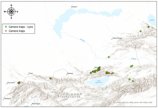 The study is complicated by the inaccessibility of lynx habitats, as well as its secretive lifestyle. As it is exceedingly elusive, this form of the lynx is poorly studied, especially in the northwest of its global range, where it inhabits the mountains of Northern and Western Tien Shan and Dzhungarian (Zhetisu) Alatau [29]. The mentioned mountains are located in the border region of Kazakhstan, China, Kyrgyzstan, and Uzbekistan.