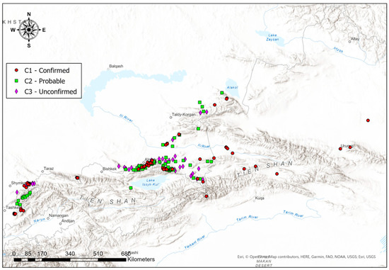 We searched extensively for observational records within our study area. The literature data used in this study were collected mainly from zoological and ecological reports of the Institute of Zoology of Kazakhstan and Specially Protected Natural Areas (PAs), zoological articles, books, conference materials, methodological manuals, etc. In order to determine the modern lynx distribution, in the Northern Tien Shan, we frequently used the records in the diaries of the inspectors (rangers) of protected areas. In the Xinjiang part of Tien Shan, we mainly relied on the data given in the papers and reports of Ablimit et al. [42], the Leading Group for Application of WNH of Xinjiang Uygur Autonomous Region [87], and Tancheng Dong et al. [88], and we also examined the locations mentioned in craniological notes of lynx skulls by A. Regel (collected in 1880; Skulls No. 1164, 1284, 1287, 1325; Zoological Institute of Russian Academy of Science, St. Petersburg, Russia). One location presented in the gbif.org database was examined as well (accessed on 16 April 2022). In the Western Tien Shan, we often relied on the occurrence data by Bykova et al. [67] and Shakula et al. [89] and the oral communication of S.V. Baskakova. In the Zhetisu Alatau, one location given by V.A. Zhiryakov and B.R. Baidavletov [32] was considered for the lynx occurrence data. The reliability of all regions of lynx encounters, provided in scientific papers and reports, were reviewed and verified. Oral communications were taken from experienced researchers in the area.