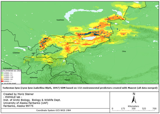 Turkestan lynx (Lynx lynx isabellina Blyth, 1847) SDM based on 132 environmental predictors created with Maxent for the Tien Shan—Alai region.