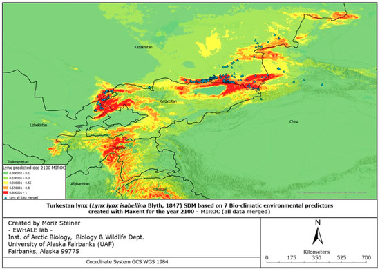 Turkestan lynx SDM based on 7 bio-climatic environmental predictors created with Maxent for the Tien Shan—Pamir-Alai region for the year 2100—MRI.