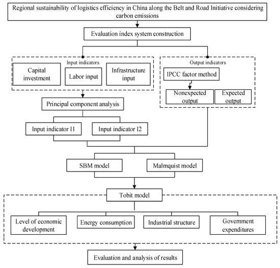 35]. Second, principal component analysis is used to extract the principal components and use them as input indicators, and after the two input indicators and two output indicators are obtained, the static and dynamic analyses of the low-carbon logistics efficiency along the regional route are substituted into the SBM-DEA model and Malmquist model, respectively. Finally, the Tobit model is used to conduct regression analysis on four influencing factors: level of economic development, energy consumption, industrial structure, and government expenditures. The main research models and their applications are shown in