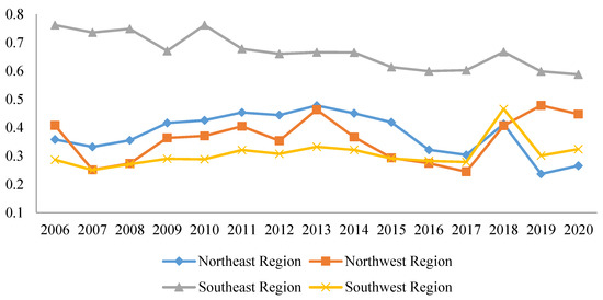 Figure 7 reflects the efficiency of the logistics industry in the four regions along the route. From high to low, they are southeast > northeast > northwest > southwest. The reason for this may be that the southeast and northeast regions are located in the eastern economic belt of China’s three major economic belts; are leading in terms of external economy, human resources, and logistics industry infrastructure; and have formed a certain degree of scale effect. The northwest and southwest regions, on the other hand, have a late start in the logistics industry due to geographical influences and a relative lack of logistics infrastructure and logistics talents, so the efficiency of the logistics industry is still at a low level [