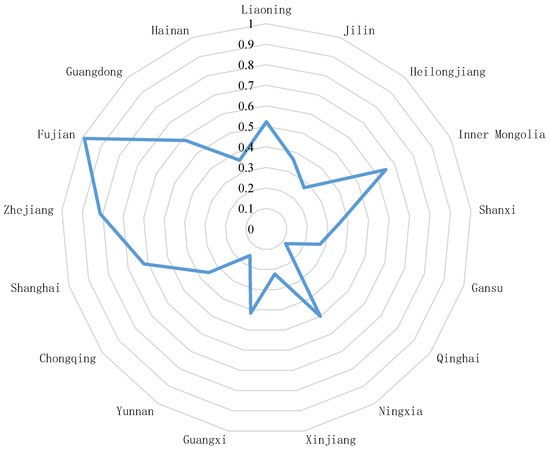 Figure 8 can visually reflect the uneven development of the logistics industry in the provinces and cities along the route region from 2006–2020. Only two provinces, Fujian and Zhejiang, have an average value of logistics industry efficiency above 0.8, which belongs to the high comprehensive efficiency region. Five provinces and cities, namely, Liaoning, Inner Mongolia, Ningxia, Shanghai, and Guangdong, have an average value of logistics efficiency above 0.45, which belongs to the general comprehensive efficiency region. The remaining provinces and cities have an average value of logistics efficiency below an average value of 0.445 for the whole region along the route, which belongs to the low comprehensive efficiency region. In particular, the average value of logistics efficiency in Qinghai and Yunnan is below 0.2, indicating that the development of the logistics industry in these two provinces is relatively backward.