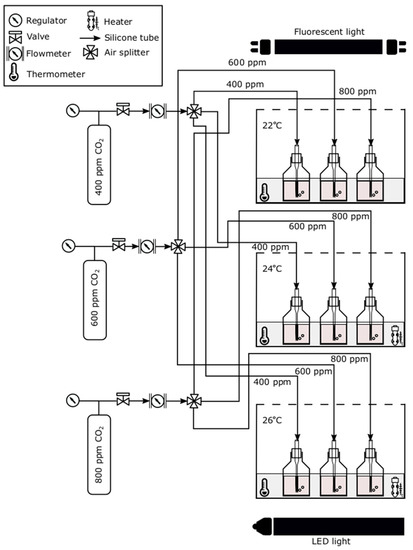 The experimental set-up (Figure 1) consisted of three gas cylinders with the following gas mixture composition: 0.04% (400 ppm) CO2, 21% O2 and 78.96% N2; 0.06% (600 ppm) CO2, 21% O2 and 78.94% N2; and 0.08% (800 ppm) CO2, 21% O2 and 78.92% N2. Flowmeters (model Y21B1501HA-AG) were connected to the cylinder regulators to control the flow rate of the output gas. An output gas flow rate of 17.7 mL/min was maintained during the experiments. The cylinders (primary standard: +/−5% blend tolerance) and the flowmeters were procured from Airgas USA, LLC. Silicone tubes were connected to the flowmeter outlets to channel the gas mixtures to three air splitters. The control valves of the air splitters were regulated to gradually discharge the gas mixtures to the respective cultures, maintained in polycarbonate bottles. The cultures were placed in temperature-controlled water baths inside three glass tanks (10 L). The tanks were filled with deionized water until the cultures were fully submerged. Aquarium heaters with thermostat (EHEIM JAGER model 3612090) were installed in two of the tanks to maintain the water temperature at 24 °C and 26 °C, respectively. The water temperature of the third tank was the same as the ambient temperature of the walk-in incubator (22 °C). A thermometer was placed in each tank to monitor the water temperature.
