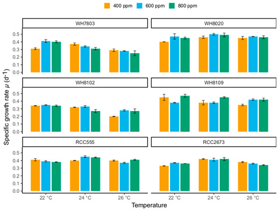 Specific growth rates µ (d−1) of the Synechococcus strains under the different temperature and CO2 treatments. X axes represent the temperature treatments used (22 °C, 24 °C and 26 °C) and Y axes represent the specific growth rates µ (d−1) obtained. The legend (on the top) represents the three CO2 levels (400 ppm, 600 ppm and 800 ppm) used in this study. Error bars denote SE.