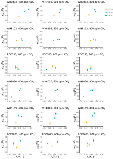 The dark-adapted photosynthetic efficiency (Fv/Fm) and the functional absorption cross-section of PSII in the dark-adapted state (σPSII) of the Synechococcus strains under the different temperature and CO2 treatments. X axes show the Fv/Fm (-) values and Y axes show the σPSII (Å2). The legend on the right represents the three temperature levels (22 °C, 24 °C and 26 °C) used in this study. Error bars denote SE.