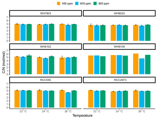 In WH7803, the mean C/N ratios (mol/mol) ranged from 4.74 at 26 °C and 600 ppm CO2 to 5.05 at 22 °C and 400 ppm CO2. For the strains WH8020 and WH8102, the C/N ratios (mol/mol) showed similar trends as those observed in WH7803. The mean C/N ratios (mol/mol) ranged from 4.51 to 4.79 in WH8020 (Figure 4) and from 4.75 to 5.55 in WH8102 (Figure 4). In WH8109, the lowest mean C/N (mol/mol) of 4.68 was obtained at 26 °C and 600 ppm CO2 and the highest mean C/N (mol/mol) of 6.12 was obtained at 26 °C and 400 ppm CO2 (Figure 4). Under the rest of the CO2 and temperature treatments, the mean C/N (mol/mol) values ranged from 5.32 (at 22 °C, 800 ppm CO2) to 5.73 (at 26 °C, 800 ppm CO2) in WH8109.