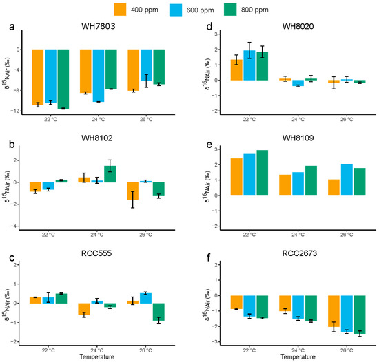 The nitrogen stable isotopic composition, δ15NAir (‰) of the Synechococcus strains (a–f) under the different temperature and CO2 treatments. X axes represent the temperature treatments used (22 °C, 24 °C and 26 °C) and Y axes represent the δ15NAir (‰) obtained. The legend (on the top) represents the three CO2 levels (400 ppm, 600 ppm and 800 ppm) used in this study. Error bars denote SE. Triplicate measurements of nitrogen stable isotopic composition could not be performed in the strain WH8109 because low biomass concentration was obtained in this strain after the experimental treatments.