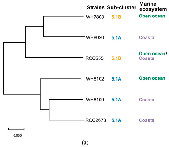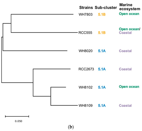 The phylogeny of the Synechococcus strains based on the CCM proteins BicA (a) and ChpX (b). The columns on the right show the marine sub-cluster the strains belong to the marine ecosystem they were isolated from. The maximum likelihood method and JTT matrix-based model (Jones et al., 1992 [41]), as implemented in the software MEGA X, were used to construct the phylogenetic trees. The trees are drawn to scale, with branch lengths measured in the number of substitutions per site.