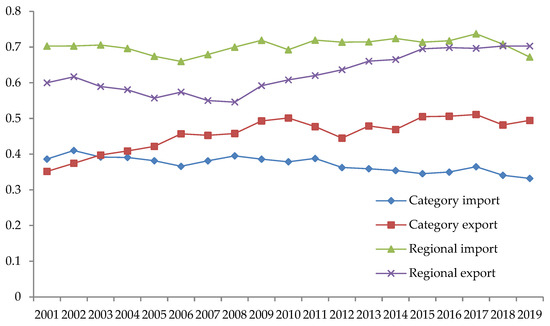 According to Table 1, the import and export of agricultural products categories between China and B&R countries are highly concentrated. Agricultural products are classified using SITC into 22 chapters, of which the first 10 chapters account for more than 80% of the total proportion of trade, so that more than 80% of the total trade is concentrated in 45% of the agricultural product categories. Among them, from the time series, the share of China’s agricultural products’ import categories showed a decentralized trend, decreasing from 94.94% in 2009 to 90.37% in 2019, while China’s agricultural products export categories showed a relatively concentrated trend, increasing from 82.54% in 2001 to 90.02% in 2019. In terms of specific types of agricultural products, China’s agricultural imports to B&R countries are more evenly concentrated into five categories: 02 (dairy products and poultry eggs), 23 (crude rubber), 05 (vegetables and fruits), 42 (fixed vegetable fats and oils), and 03 (fish, crustaceans, mollusks and aquatic invertebrates, and their products), while China’s exports to B&R countries are highly concentrated into two categories of agricultural products: 05 (vegetables and fruits) and 03 (fish, crustaceans, mollusks, and aquatic invertebrates and their products), with five products accounting for approximately 45% of the total in recent years.