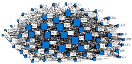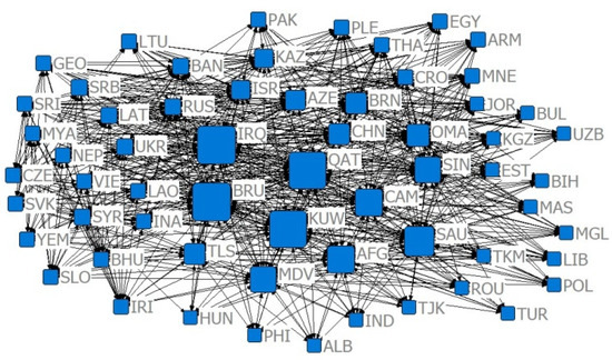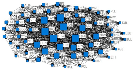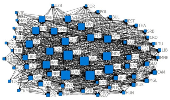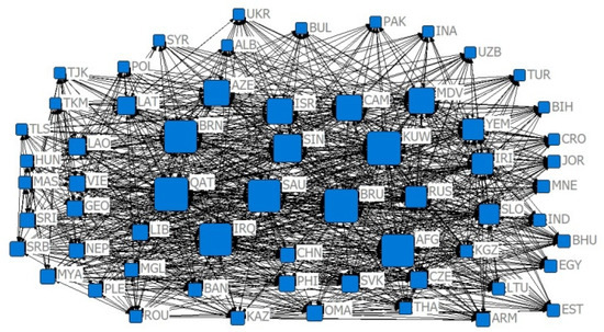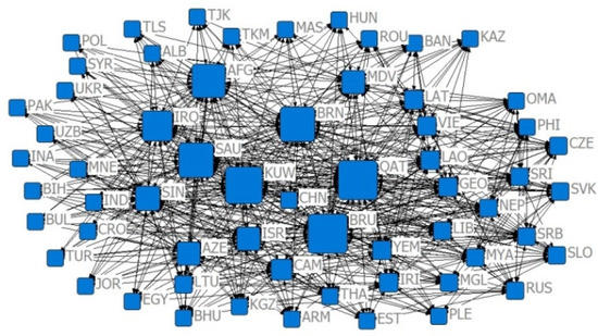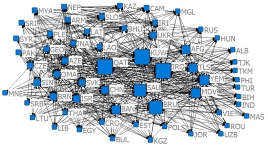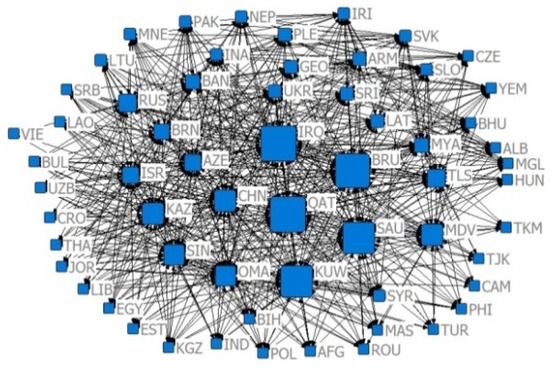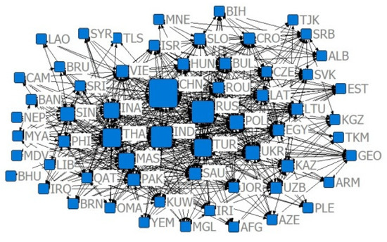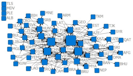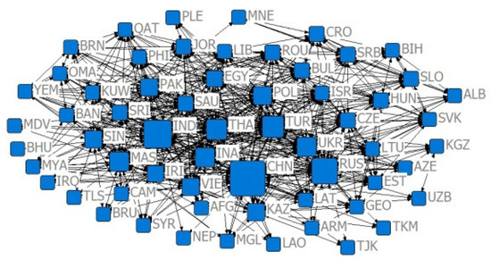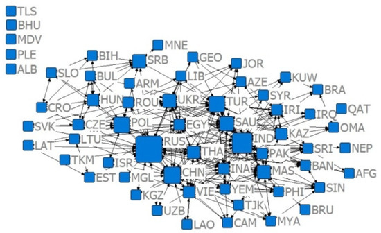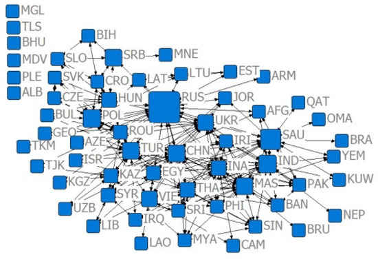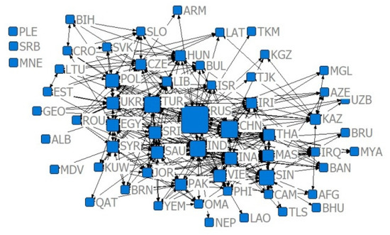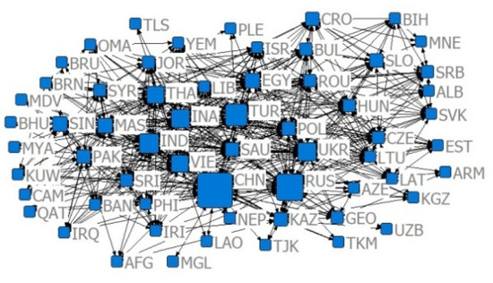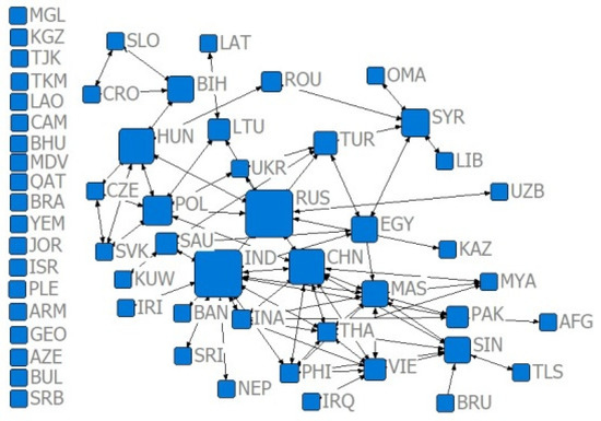 In order to reflect the closeness of the trade relations, in this paper, referring to the method of Li Jing et al. (2017) [37], the import–export relationship is divided into US $10 million and US $100 million categories, and the existence of significant trade relations is judged if the trade volume between the two countries meets the classification criteria. If the index is less than 0.7 and 0.8, a significant competitive advantage relationship is indicated. In order to reflect the evolution of the agricultural trade network between China and B&R countries from 2001 to 2019 based on the cross-sectional analysis of the trade network analysis as a single year, considering the financial crisis in 2008 and the “Belt and Road” initiative proposed by China for the first time in 2013, and other important nodes due to the delayed impact of the financial crisis, which generally only appeared in 2009, we selected four different years, 2001, 2009, 2013, and 2019, as representatives, and constructed 16 trade networks according to the time dimension and the degree of trade relations (Figure 2, Figure 3, Figure 4, Figure 5, Figure 6, Figure 7, Figure 8, Figure 9, Figure 10, Figure 11, Figure 12, Figure 13, Figure 14, Figure 15, Figure 16 and Figure 17).