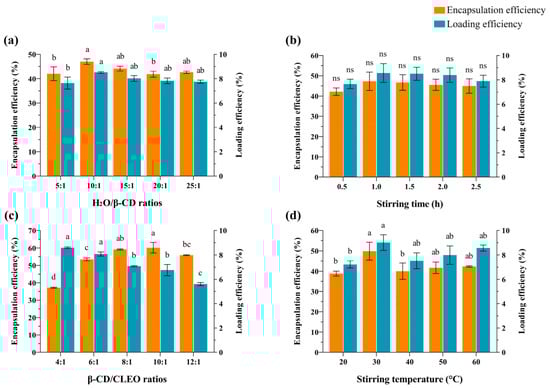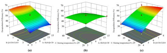 | H2O/β-CD Ratio (mL/g) | β-CD/CLEO Ratio (g/mL) | Stirring Temperature (°C) | Encapsulation Efficiency (%) | |