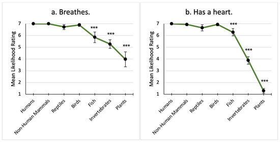 Attribution of “breathes” (a) and “has a heart” (b) plotted by target category. The x-axis is organized by decreasing taxonomic distance from humans (far left). Error bars represent 95% confidence intervals. Asterisks indicate significant difference from attribution to humans by Bonferroni comparison, *** p < 0.001.