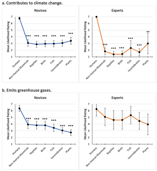 Novice and expert attributions of “contributes to climate change (a) and “emits greenhouse gases” (b). The x-axis is organized by decreasing taxonomic distance from humans (far left). Error bars represent 95% confidence intervals. Asterisks indicate significant difference from attribution to humans by Bonferroni comparison, ** p < 0.01, *** p < 0.001.