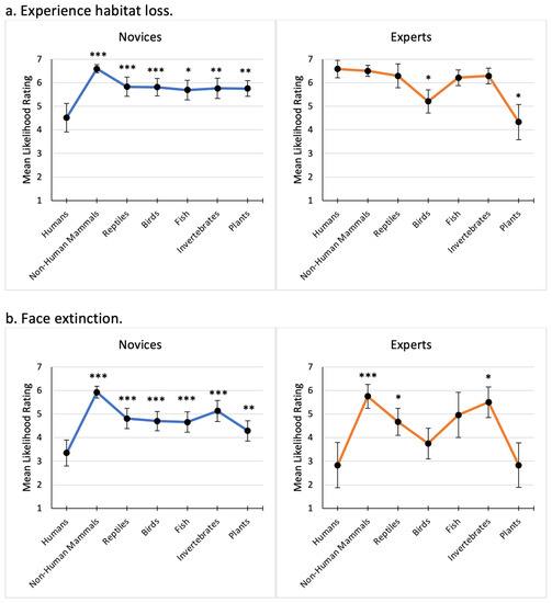 Novice and expert attributions of the likelihood that target species will “experience habitat loss” (a) and “face extinction” (b). The x-axis is organized by decreasing taxonomic distance from humans (far left). Error bars represent 95% confidence intervals. Asterisks indicate significant difference from attribution to humans by Bonferroni comparison, * p < 0.05, ** p < 0.01, *** p < 0.001.