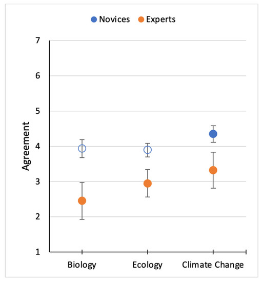 Novice and expert agreement (ranging from 1 “strongly disagree” to 7 “strongly agree”) with explicit exceptionalist statements about biology, ecology, and climate change. Error bars represent 95% confidence intervals. Solid dots represent means that differ significantly from the midpoint of the scale (4) via one-group t-test p < 0.05.