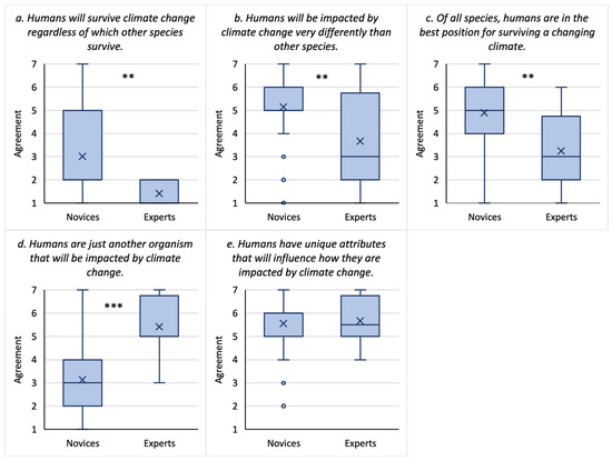 Novice and expert agreement (ranging from 1 “strongly disagree” to 7 “strongly agree”) with individual explicit exceptionalism items relevant to global climate change (a–e). Asterisks indication significant differences via t-test, ** p < 0.01; *** p < 0.001.