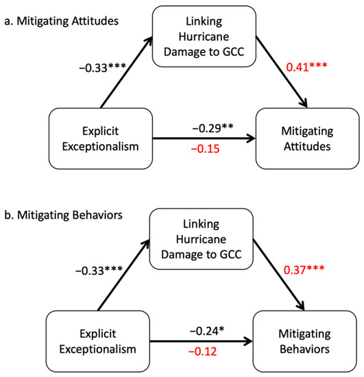 The fact that explicit exceptionalism was related to both linking hurricane damage to global climate change and mitigating attitudes and behaviors via first-order correlations (Table 1), but not to mitigating attitudes and behaviors via multiple regressions (Table 2), raises the possibility of a mediation relationship [110,111] whereby linking hurricane damage to climate change may act as a mediator between explicit exceptionalism and mediating attitudes and behaviors. To explore this possibility, we computed two mediation models in which explicit exceptionalism predicted mitigating attitudes (Figure 7a) and mitigating behaviors (Figure 7b) with attribution of damage to climate change as a mediator. This interpretation is in line with the proposal that attribution of damage to climate change is a critical step necessary to produce increased mitigating attitudes [112]. We used the Sobel test for mediation using the bootstrapping method with bias-corrected confidence estimates of coefficients [113,114] using the jamovi Advanced Mediation Models module developed for this purpose [115].