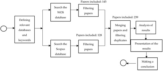 Figure 1 shows the approach to the research. The keywords used when searching the databases were “urban mobility”, “electric vehicles”, and “autonomous vehicles”. An initial search of the WOS database identified 145 papers, while a search of the Scopus database using the same keywords identified 128 papers. In this bibliometric review, only scientific papers are included, while books and chapters in books were excluded. After filtering, the total number of papers included in the research was 239.