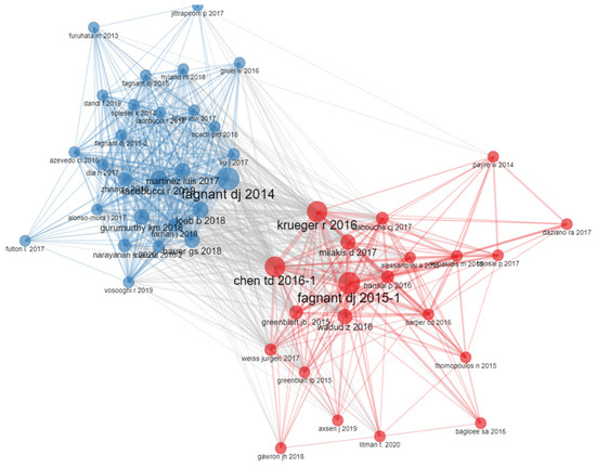 Figure 3 shows the analysis of the co-citations indicating the influence that an individual author and their research has on other authors, i.e., other research. The authors and their papers are shown in circles. The larger the size of the circle, the greater the citation, i.e., the greater the influence of the author and their paper. On the other hand, all of the circles, i.e., all of the authors and their papers, are interconnected with lines. The greater the number of lines and the thickness of the lines, the more significant the influence of the paper and the author. The authors are divided into two clusters, red and blue, and the clusters are defined according to similarity, i.e., the field of research the authors deal with.