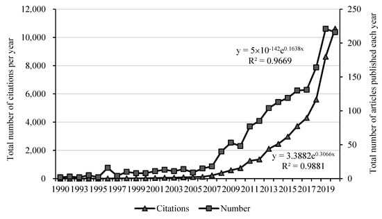 For the quantitative work, our method was: apply exponential fitting to the number of articles published each year and the number of citations. The R-squares of the curves are 0.967 and 0.988, respectively, indicating that the number of research documents and citations in the field of commodity prices has exponentially increased; this reflects the high degree of concern of the academic community on commodity prices in recent years.