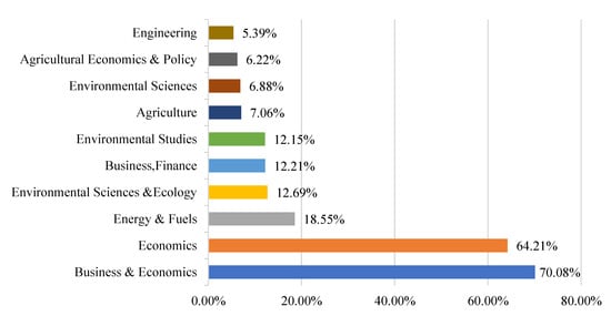 Figure 2 shows the main research areas of commodity prices and their proportions. The research direction is given by the Web of Science database. Since the research content of a document may involve multiple fields, the proportions of each field add up to more than 100%. It can be seen that the research is mainly concentrated on economics and energy, with a small proportion of research focusing on finance.
