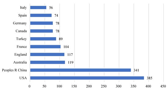Figure 3 shows the cooperation network in the country where the first author of the article is located. According to Figure 3, the United States, China, Australia, and France are at the center of the network, forming a relatively close cooperative relationship, and each has cooperation with many other countries. Judging from the average year of publication, the United States, Canada, and other countries started research in this area earlier. While China started late, Chinese authors quickly occupied the sub-center position of this network. Figure 4 summarizes the number of publications in the country of the first author. The United States (385) and China (341) have the largest number of publications. The sum of the number of articles from the two countries accounts for more than one-third of the total publications, followed by Australia (119), England (117), and France (104). The total number of articles by researchers in these five countries accounts for more than one-half of the total.